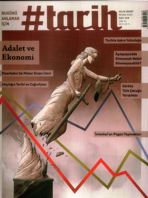 #tarih dergisinin kapağında, ekonominin çarpmasıyla kökünden parçalanıp düşmek üzere olan bir Adalet Tanrıçası görüyoruz. Türkiye’de adaletin temelinden sarsılmasının sebeplerinden biri olarak ekonomiyi irdeleyen kapak, bu ikilinin ülkemizdeki çalkantılı tarihine bir gönderme yapıyor.