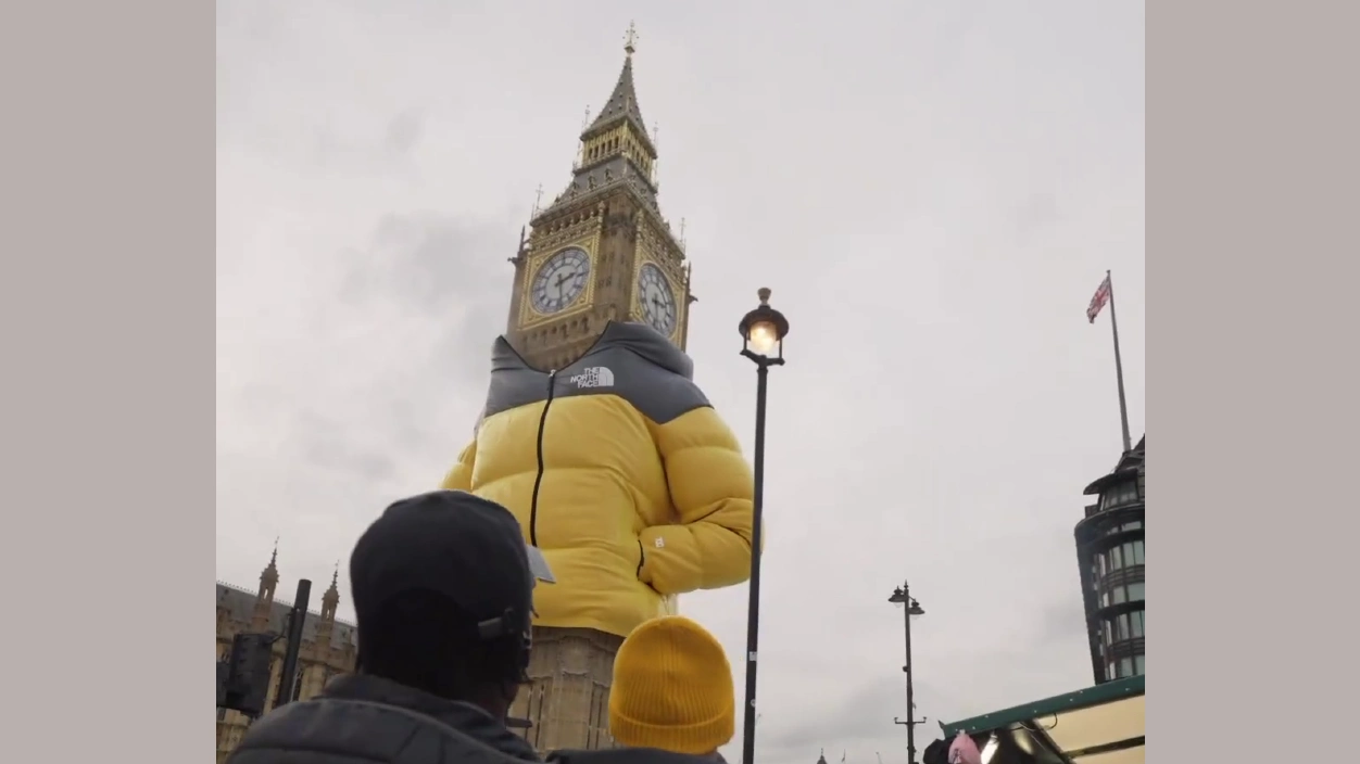 JD Sports’un sosyal medya paylaşımında 310 metre yüksekliğindeki saat kulesi, kışı The North Face’in sarı renkli 1996 Retro Nuptse montuyla karşılıyor. Sosyal medyada denk gelen kimilerinin gerçek sandığı videoda kalabalığın önündeki The North Face montlular da konuşmalarıyla inandırıcılığı pekiştiriyor.