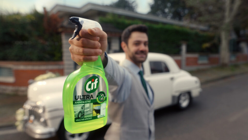 Reklam filminin girişinde yeşil renkli Cif Ultra ile mangal, araba, tekerlek gibi farklı yüzeyler hızlı bir şekilde temizleniyor. Devamında ise mutfaktaki yağlı yüzeylerin temizlendiği, pembe renkli Cif Ultra Sakura ürünü görülüyor.