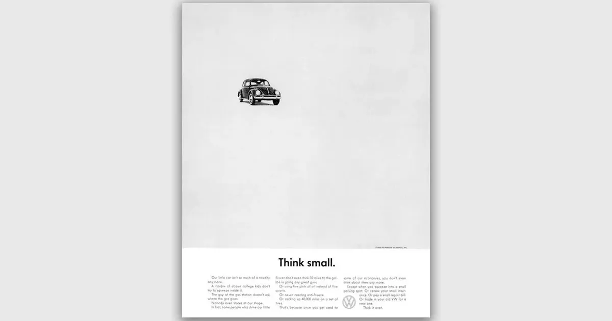 Volkswagen’in “Küçük Düşün” sloganı, dürüstlüğü ve sadeliğiyle dönemin tüm reklamcılık geleneklerini altüst etmişti. Bu kampanya hâlâ tüm zamanların en iyi reklamlarından biri olarak kabul ediliyor.