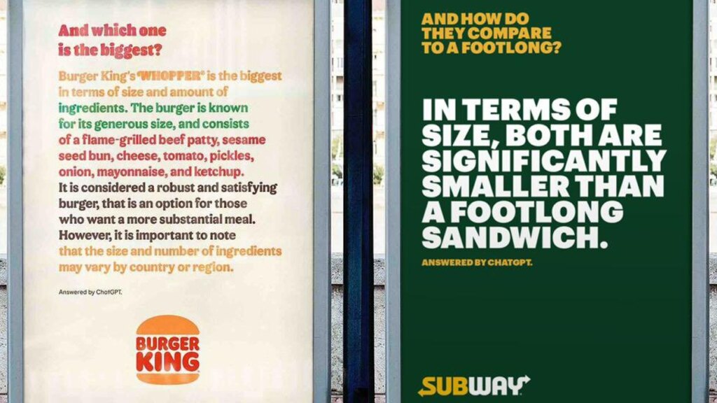 ChatGPT’nin en ikonik burger ve en büyük burgerin hangileri olduğuna verdiği yanıtlarla “AItışma” yaşayan McDonald’s ve Burger King ikilisine Subway yine bir ChatGPT yanıtıyla karşılık verdi. Chatbot’tan Big Mac ve Whopper’ı footlong sandviçle kıyaslamasını isteyen Subway, aldığı yanıtı kampanyasına taşıdı.
