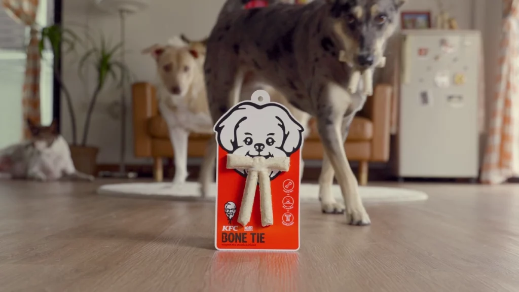 Hem köpek sahiplerini bu ikilemden kurtarmak hem de köpeklerin sağlığını koruma altına almak isteyen KFC Tayland, köpeklerin de tüketebileceği özel tavuk kemikleri hazırladı. Köpek atıştırmalıkları üreticisi Momo and Friends ile işbirliği yapan marka, Albay Sanders’ın papyonu şeklindeki özel atıştırmalığı köpek sahipleriyle buluşturdu.