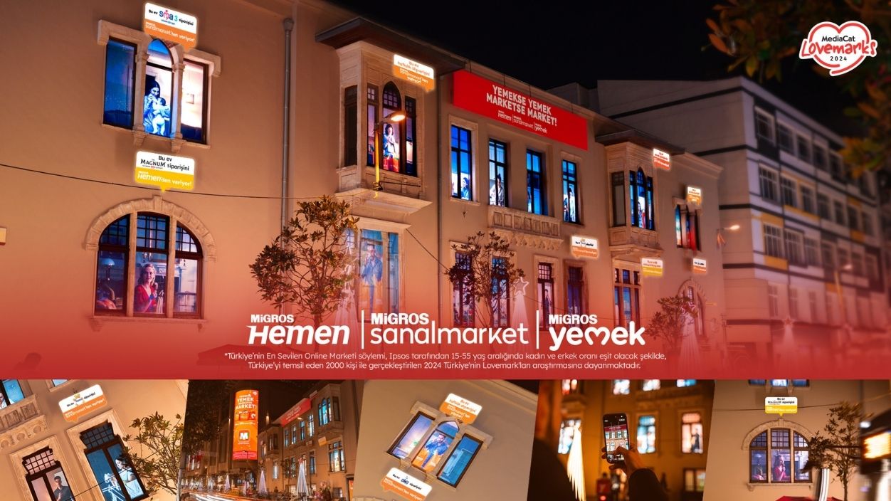 Bina, Migros’un çoklu hizmet dünyasını yansıtan bir apartmana dönüştürüldü. Migros Sanal Market, Migros Hemen ve Migros Yemek’in birlikte kurgulandığı bu projede, her pencere farklı bir ihtiyacı anlatan konuşma balonlarıyla canlandırıldı. Bir daire akşam yemeğini Migros Yemek’ten söylerken, bir diğeri anlık market alışverişini Migros Hemen’den, bir başkası haftalık alışverişini Migros Sanal Market’ten yapıyor.
