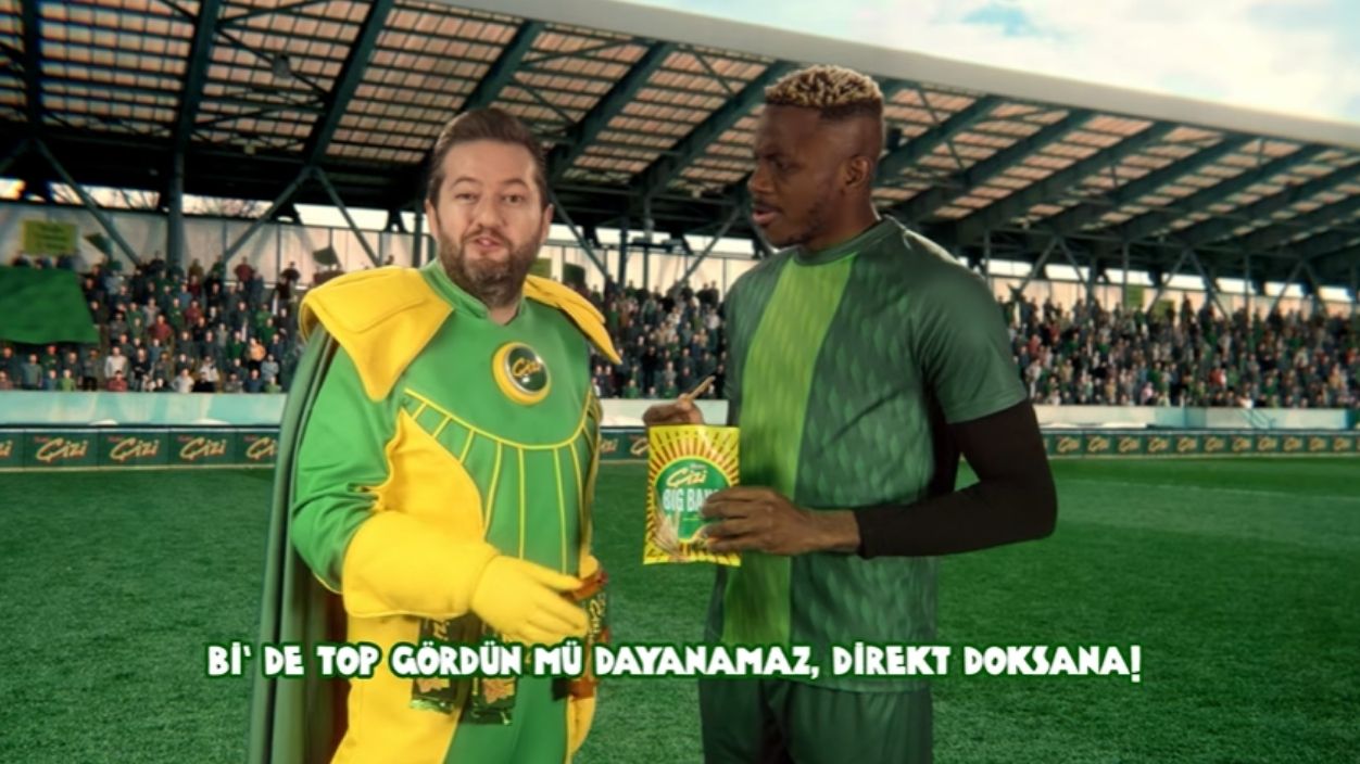 Reklam filmi, Çizimen’in Osimhen’in efsanevi gollerine olan hayranlığını dile getirmesiyle başlıyor. Çizimen, Çizi Big Bang’in yeni aromalarını “Çizi’nin yeni transferleri” olarak sahaya sürüyor. Osimhen’in kendisine ikram edilen çubuk krakerleri büyük bir iştahla yemesi üzerine Çizimen’in yaptığı “Transferi yedin” esprisi, kampanyanın en akılda kalıcı ve eğlenceli anlarından birini oluşturuyor.