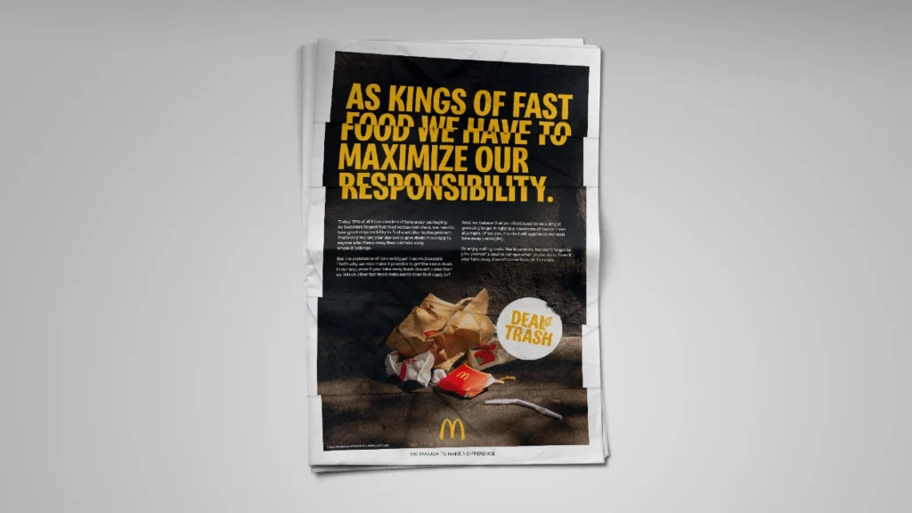 Marka şimdilerde Nord DDB işbirliğiyle hayata geçirdiği “Deal with the Trash” kampanyasıyla çevre dostu uygulamasını bir adım öteye taşıdığını duyuruyor. Öyle ki ülkedeki diğer fast food oyuncuları Max Burgers ve Burger King’in ambalajları da çöp kutusuyla buluştuğunda McDonald’s uygulaması aracılığıyla taranabilecek ve ödüle dönüşebilecek. Televizyon, dijital kanallar, sinema, basın ve açıkhavada yer alan kampanyayla daha fazla insan çöplerini doğru yere atmaya teşvik edilecek.