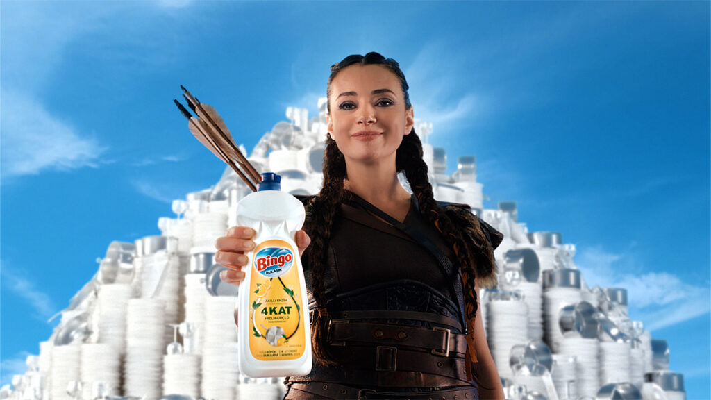 Hayat Kimya’nın ev bakım kategorisindeki markası Bingo, yeni reklam filmini yayınladı. Reklam filminde Özgü Namal, kurgusal karanlık bir dünyada kirli, yağlı, pis tava, tencere ve tabaklardan oluşan dağların arasından çıkarak bu sefer bambaşka bir karakter olarak izleyiciyle buluşuyor.